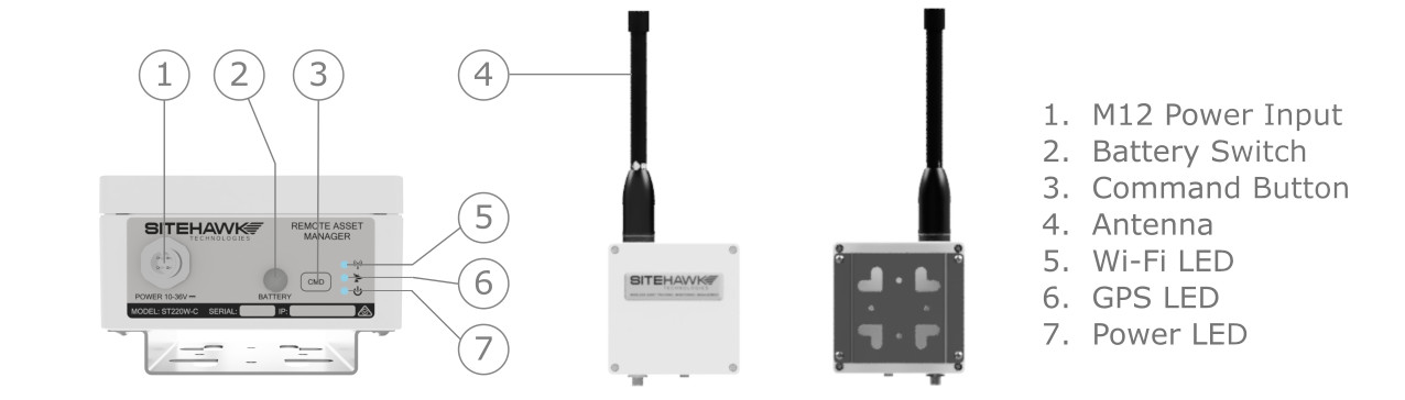 The SiteHawk ST220W provides location tracking and remote monitoring capabilities to your field equipment using your outdoor Wi-Fi network.  Installation is a simple process of mounting the device with sky-view and connecting power.  The outdoor mounting removes additional enclosure requirements and the integrated GPS and Wi-Fi antennas eliminate the complexities of RF cabling.  The minimal cabling and flexible mounting option equates to a fast and simple installation, reducing the time and complexity of deployments.